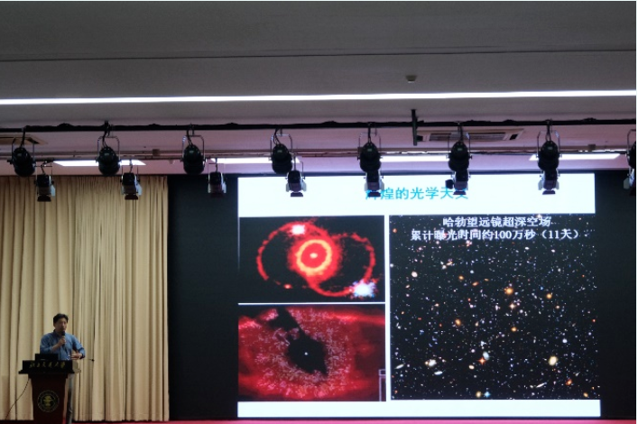 姜鹏总工程师以天文学的起源作为起始,由浅入深地向学生们讲述天文望远镜的发展历程,详细地向同学们展示了“中国天眼”的全新概念、技术特色、工程难点等重点内容。由科学成果、未来期望以及对“中国天眼之父”南仁东先生的介绍,告诫同学们要有几十年如一日坚持一项工程的情怀。最后“以不能忘记的初心:要做一台好用的望远镜,对于未来的美好愿景:希望后来者能用好这个设备,必须接受的现实:我们终将是过去时,一点奢求:希望不会被忘记”四句话结束了本次讲座。